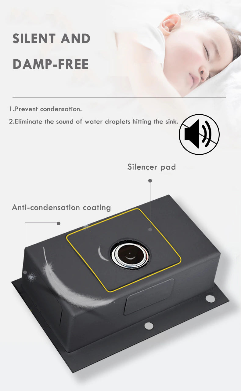 Extra-thick rubber sound dampening pads cover 80% of sink base to absorb noise and vibration.