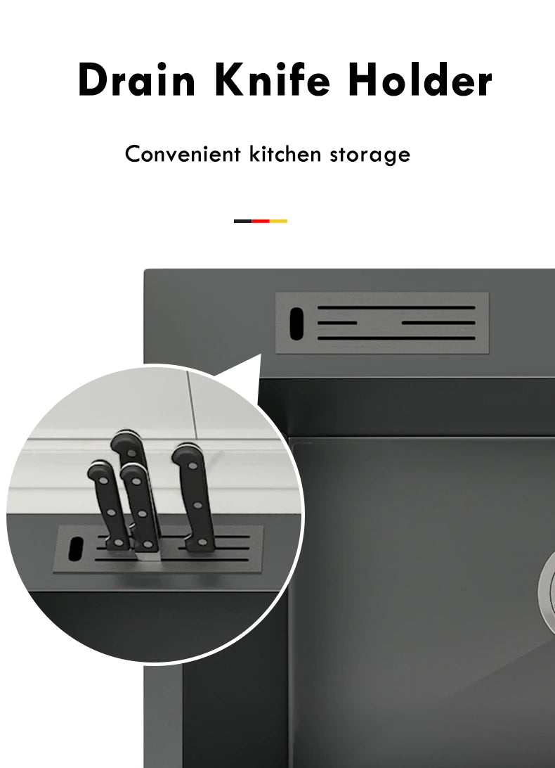 Innovative multifunctional sink, with drain knife rack, it is more convenient to store directly after use, saving kitchen space.