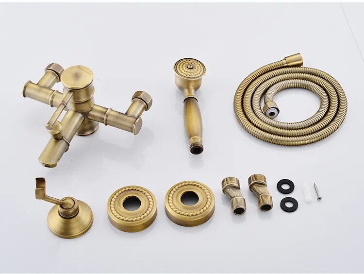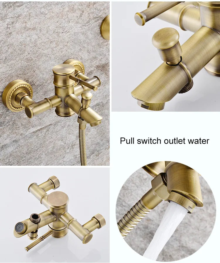 Elevate every bathing moment with this Antique Brass Shower & Tub Faucet System—a complete suite that merges sculptural elegance and spa-level function. Its solid brass construction reveals textured warmth in an aged brass finish, while the exposed wall-mounted assembly brings vintage allure into modern design.